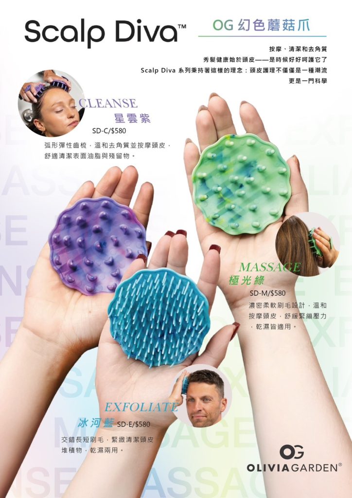 Scalp Diva™ 系列,從專業沙龍需求出發,依照不同頭皮狀態打造三款功能型蘑菇爪,讓日常洗髮與保養,不只是洗乾淨,而是真正養好頭皮。