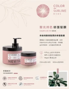 【NEVITALY】聚光持色修護髮膜專為染後及脆弱髮質設計,能夠深層滋養髮絲結構,幫助修復損傷,同時長時間維持染後色彩的亮澤。其豐盈不厚重的質地讓秀髮更加有質感,達到極致美學效果。93% 成分源自天然,88% 生物可分解,並且完全素食友好 (Vegan),符合可持續發展理念。