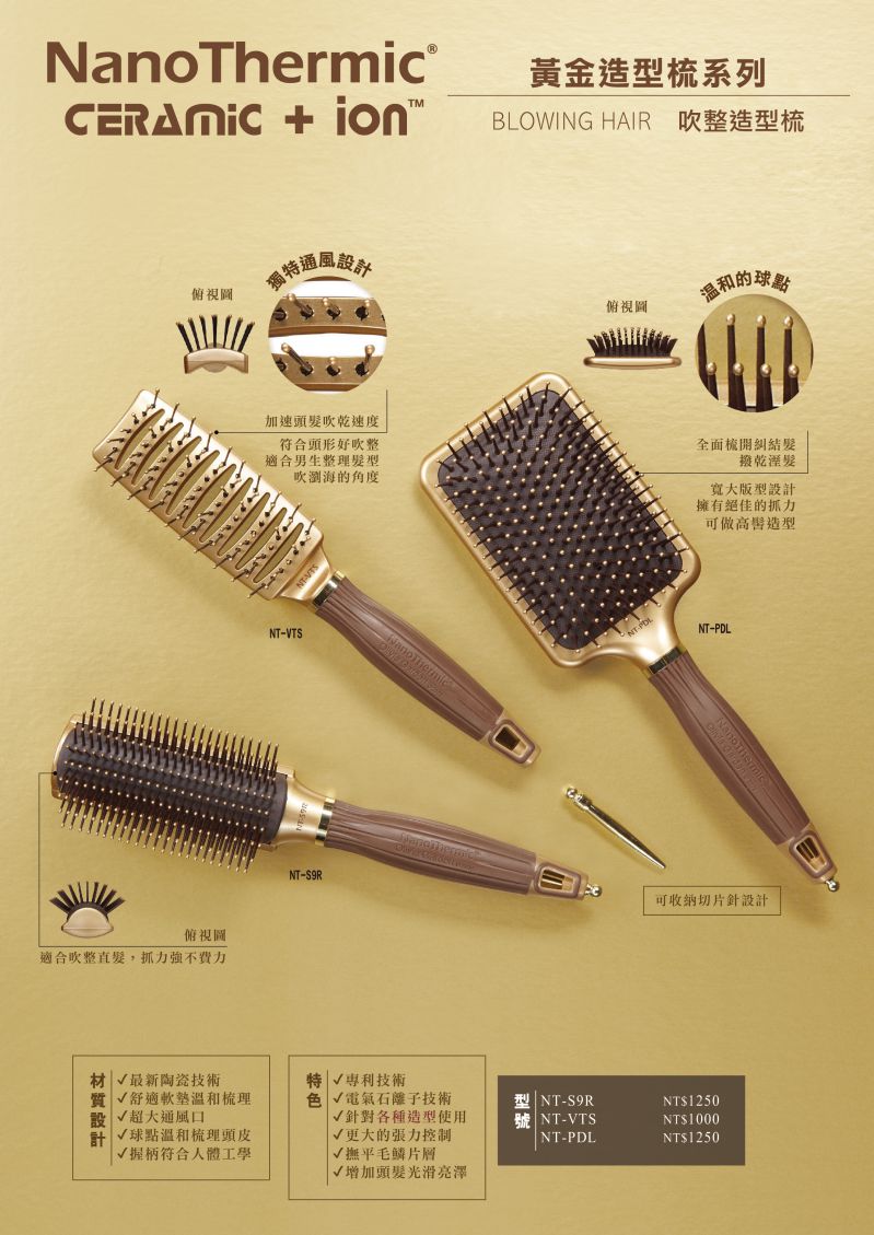 【Olivia Garden】NT陶瓷離子黃金造型梳是專為快速造型與護髮設計的專業陶瓷負離子髮梳。採用最新NanoThermic陶瓷技術,能快速加熱並保持熱量持久,實現更長效的髮型定型效果。同時,配備電氣石負離子技術,有效撫平毛鱗片層,消除靜電與毛躁,提升髮絲光澤感。梳子的超大通風孔設計,能最大限度地提升氣流,縮短吹乾時間。配有溫和球點的軟墊設計,提供頭皮按摩效果,提升梳理時的舒適度。