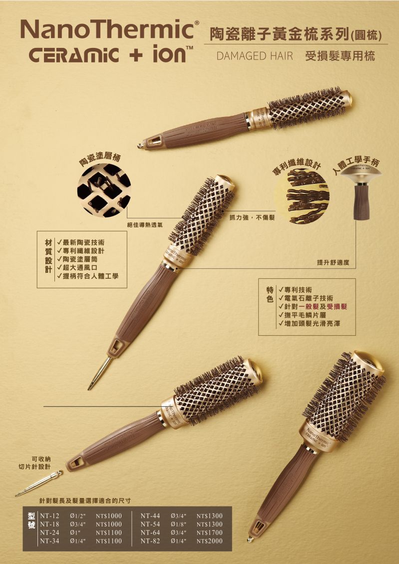 【Olivia Garden】NT陶瓷離子黃金圓梳是專為日常造型與護理設計的專業級陶瓷負離子圓梳。該梳子採用陶瓷塗層筒與S型負離子刷毛設計,能均勻分散熱量,撫平毛鱗片層,減少靜電與毛躁,使髮絲更加光滑亮澤。其超大通風口能縮短吹乾時間,讓頭髮造型更快速、更有效。梳子適用於各種髮質,特別推薦給一般髮質及受損髮質使用,提供溫和護理效果。